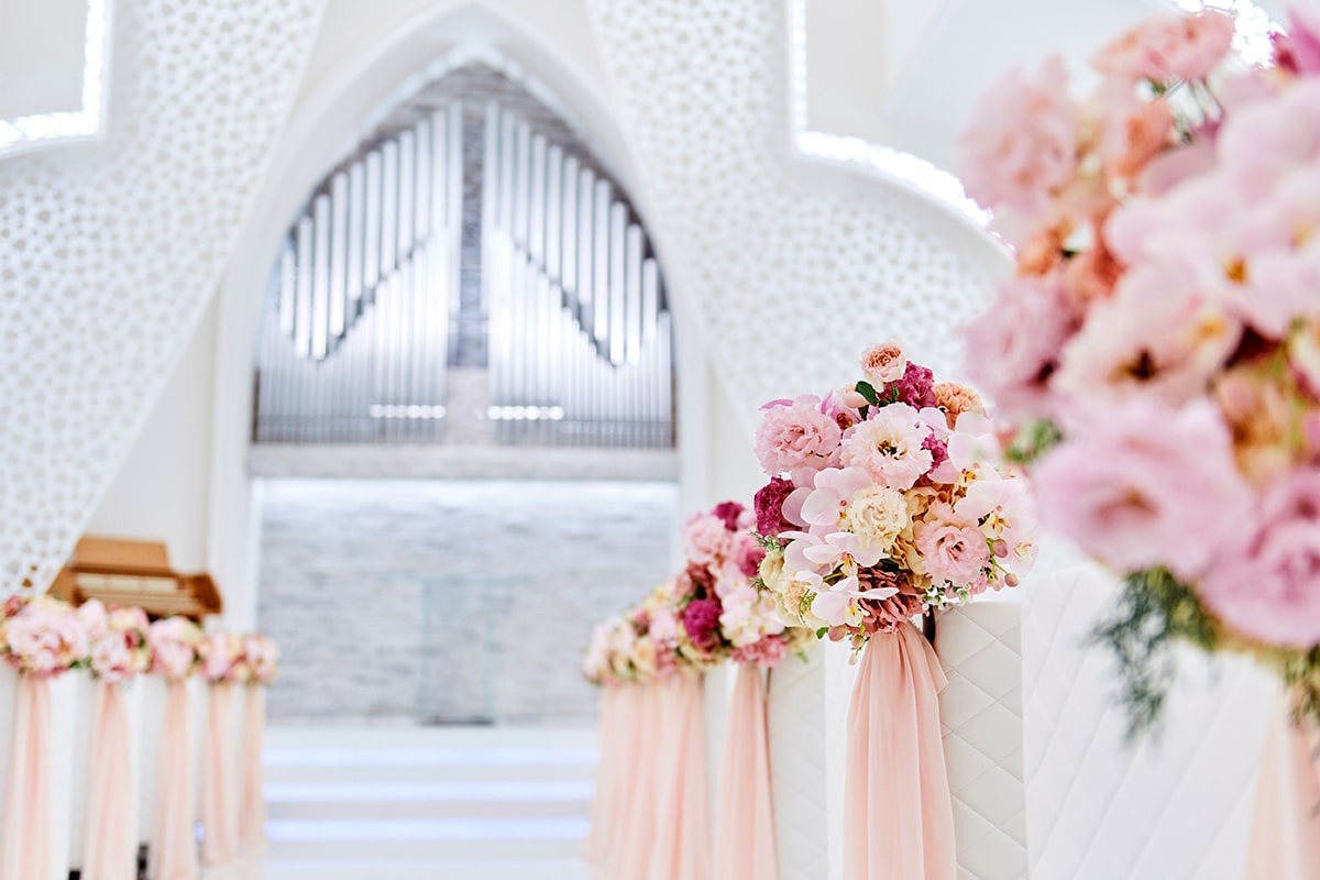 チャペル式:荘厳な大聖堂や自然光が降り注ぐ空間まで、選択肢が広がります。特にステラ・デル・アンジェロのチャペルは、光と石造りの荘厳さを組み合わせた空間で、厳粛さとロマンチックさを兼ね備えています。花嫁のドレスを引き立てる長いバージンロードや、ゲストが感動するフラワーシャワーの演出も魅力です。