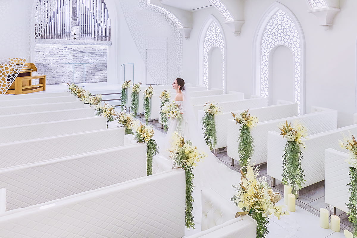 - 純白の大聖堂: 天井高10mを誇る壮大な空間は、白一色で統一されており、花嫁のウエディングドレスを一層美しく引き立てます。シャンデリアの輝きや、パイプオルガンとトランペットの生演奏が、ドラマチックな挙式を演出します。