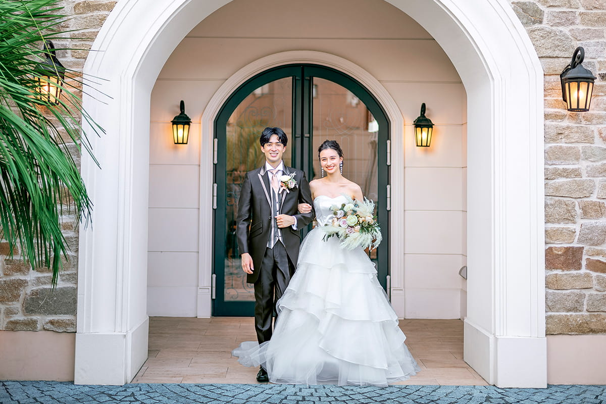 挙式の締めくくりには、新郎新婦の退場時にクロージングキスやハグを取り入れることで、ゲストに感動的な余韻を残すことができます。扉が閉まる直前のキスやハグは、まるで映画のワンシーンのようにロマンチックで、ゲストからも歓声が上がる人気の演出です。