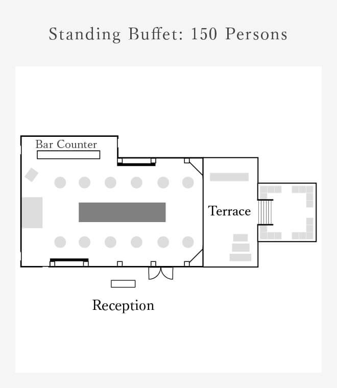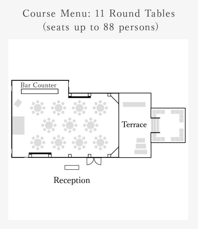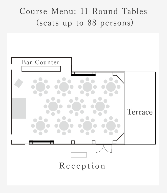 A banquet hall fit for both formal and casual use. The large skylight creates a totally different look from daytime to nighttime. The terrace retains a unique atmosphere which will richly reward your time.