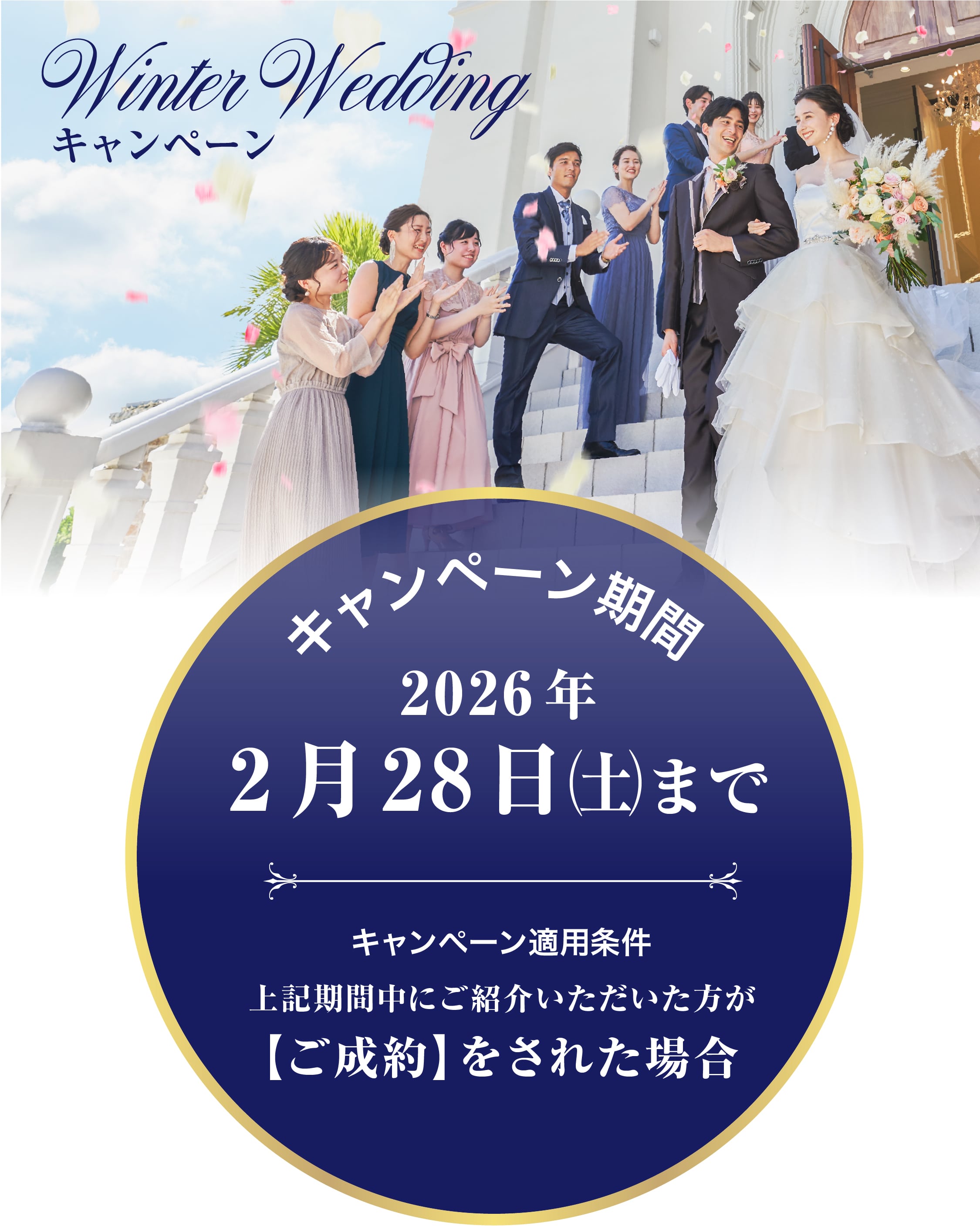 ※本キャンペーン専用の申し込みページにて取得した個人情報は、本キャンペーンに関する業務を行うために利用いたします。式場より、ご紹介いただいたご友人・ご親族様に弊社からご連絡する際、ご紹介者様のお名前をお伝えいたしますのでご了承ください。(応募時の個人情報の取扱いについてはこちらからご確認ください。)
